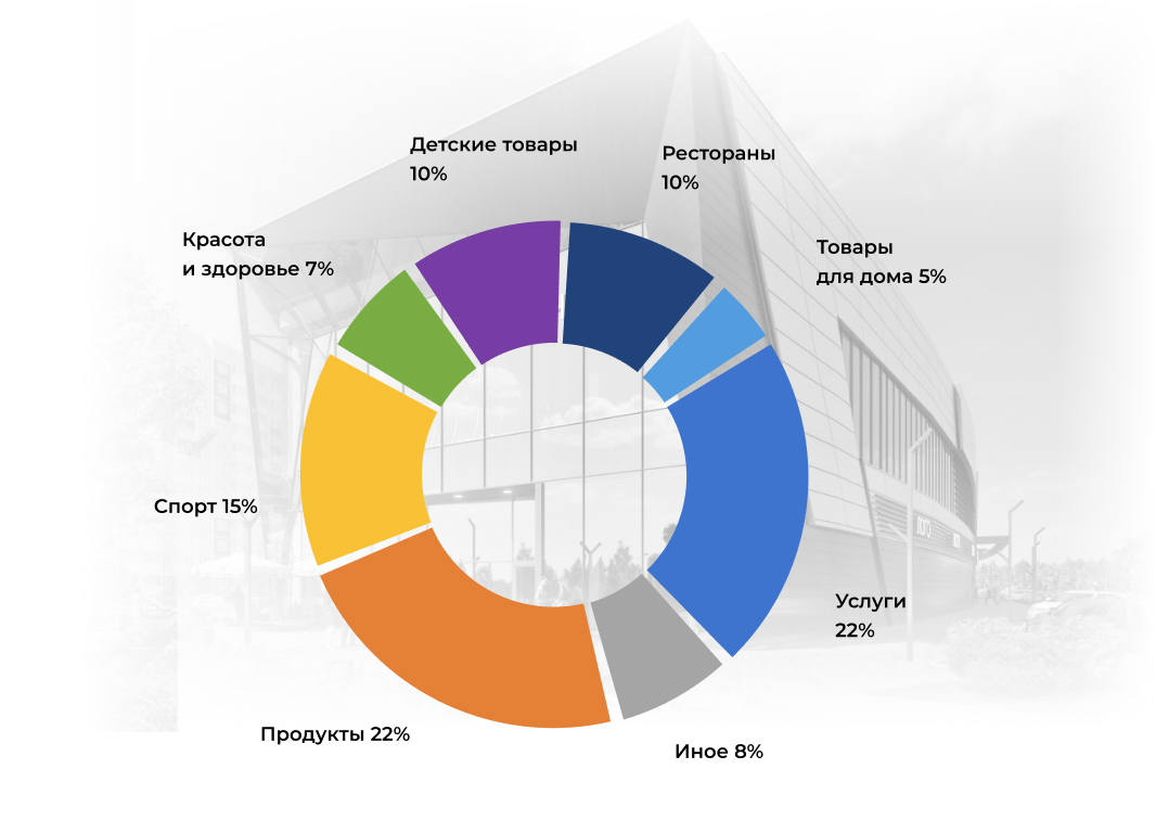 В ТЦ будут представлены все группы товаров и услуг каждодневного спроса (супермаркет, зоомагазин, детские товары, фитнес, товары для дома, косметика, салон красоты, салон связи, бытовые услуги и т.д.).